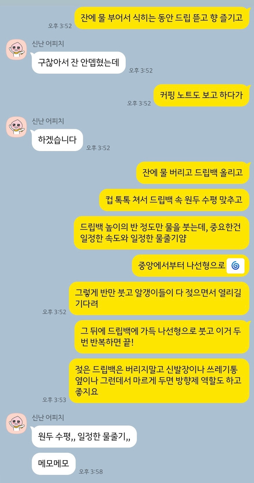 산미감 있는 커피를 좋아하는 친구는 함께 먹은 게이샤를 너무나 좋아하여 원두를 조금 싸주었다. 그 후에 이야기를 나누는데 집에서 해 먹으니 내가 내려준 맛이 안 나더라는 이야기. 드립백을 조금 더 맛있게 즐길 수 있는 방법을 알려주었다.