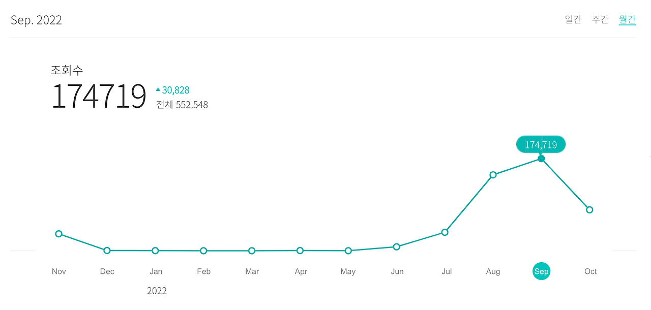 100일 챌린지를 7월에 시작한 후, 딱 중간이었던 9월에 가장 높은 조회수를 갱신했다.