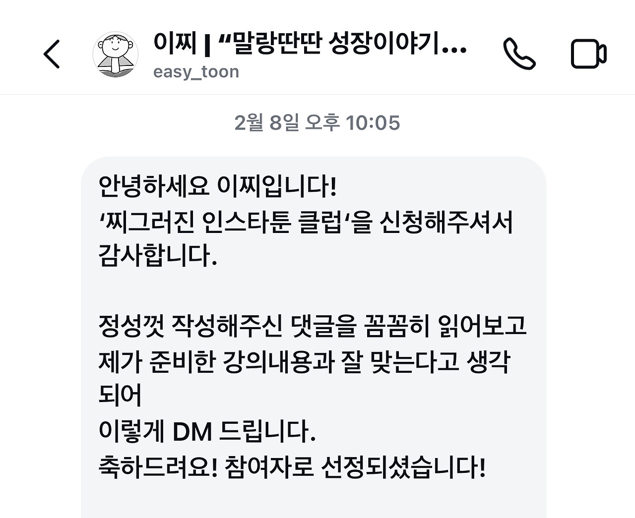 설레는 마음만큼 커지는 걱정의 목소리였다. 댓글로 수업을 듣고 싶은 이유를 쓰면, 작가님께서 하나하나 다 읽으시고 선정을 하신다 하셨다. '선정이 안 될 수도 있으니까, 일단 남겨라도 보자.'라고 생각하며 며칠 내내 고심하여 댓글에 수업 신청 이유를 적었고, 현실에 파묻혀 고새 잊고 있었다. 그러다가 받은 합격 문자. 인스타툰 수업에 선정되셨다는 문자 1통이, '너 이제 그릴 수 있어!'라고 말해주는 것 같아 벅차오르기까지 했다.