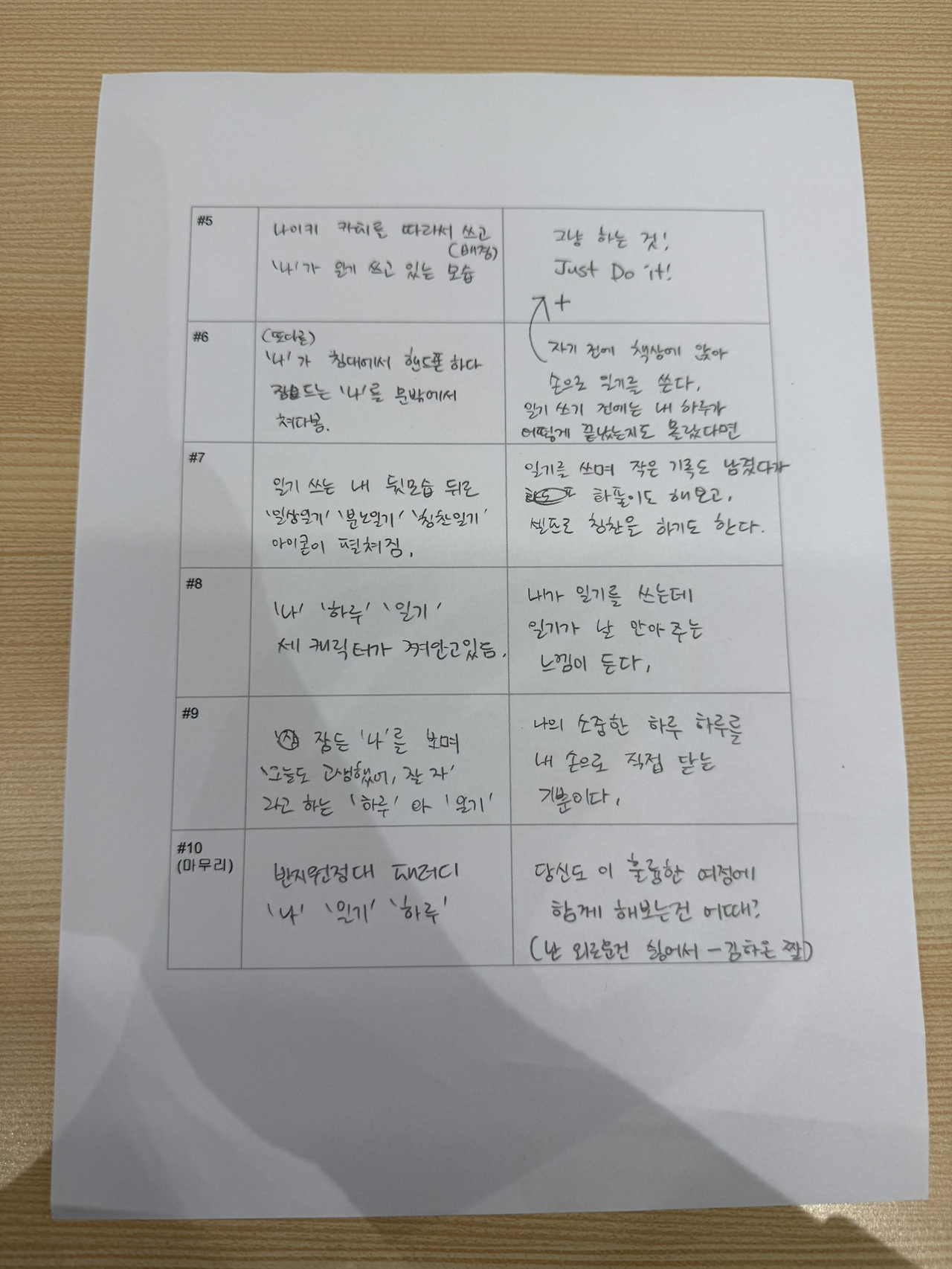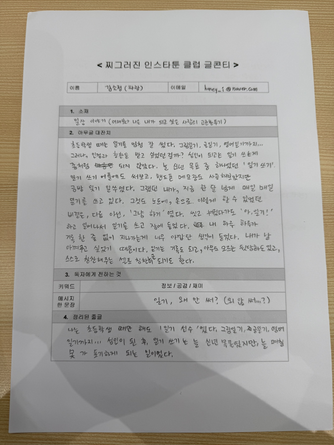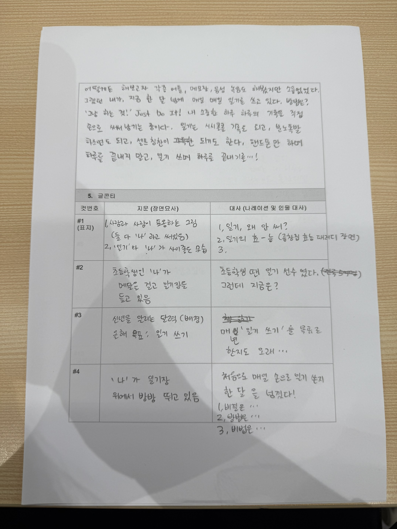 그렇게 3주간의 수업을 마치고, 마지막주 수업의 마지막 과제는 '인스타툰 1화 완성하기'였다. 어렵게 완성한 글콘티를 전부 엎어버렸다. 내가 기획한 콘티가 나에게 전혀 와닿지 않았기 때문이다. 콘티의 내용은 요즘 빠진 '일기 쓰기'에 대한 내용이었다. 글에서 그림으로 옮겨서 그리다 보니, 모르는 사람끼리도 만나면 자기소개를 하는데, 일단 첫 화는 내가 어떤 사람인지, 이 툰이 어떤 툰인지 먼저 소개해야 하는 거 아닐까? 하는 생각이 계속 들었기 때문이다.