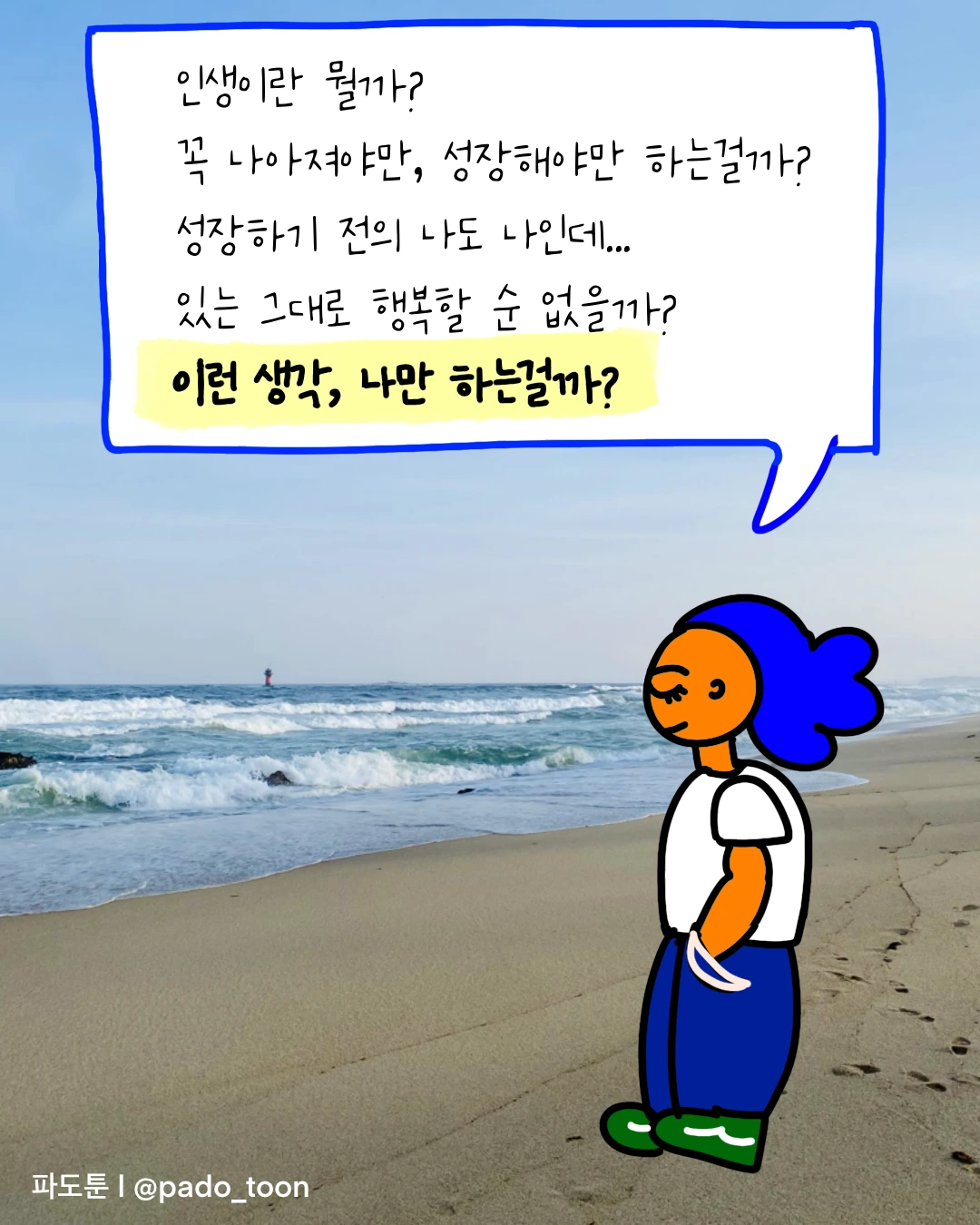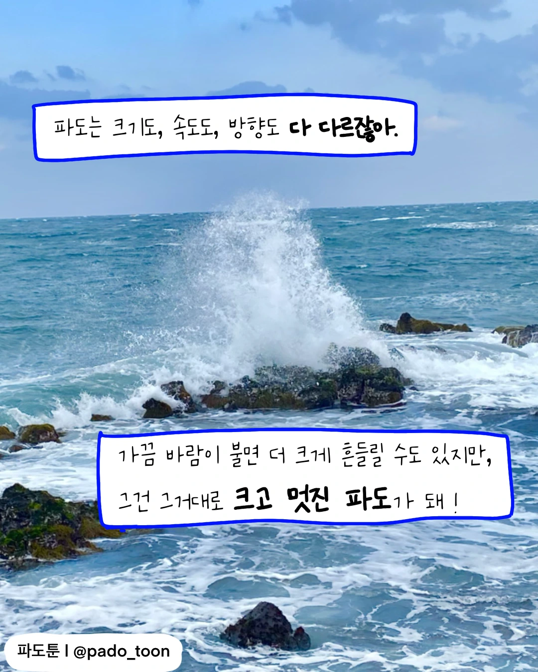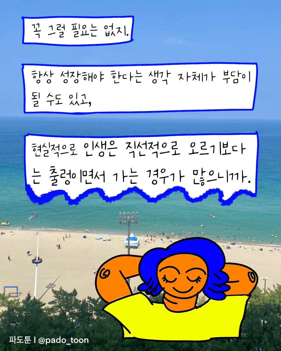내 인생을 그래프로 표현하면, 이리 저리 흔들리는 곡선이라고 생각해 왔다. 그 모양은 '출렁출렁'. 작은 출렁도, 큰 출렁도 모두 의미가 있었다. 결국엔 모두 아름다웠다. 이렇게 생각하니 인생이 파도처럼 느껴졌다. 태풍 속의 파도도, 잔잔한 파도도, 모두 아름답지 않은 파도가 없었다. 그래. 인생은 파도다. 그렇다면 내 만화는 파도툰이다!