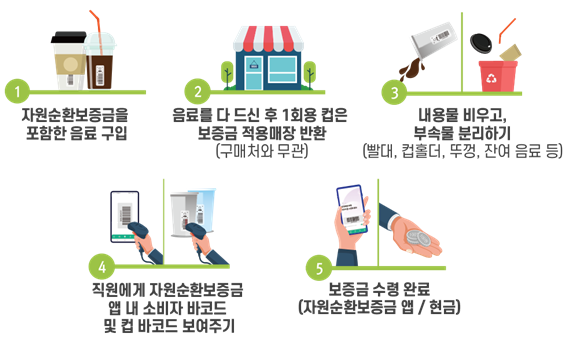 따라서 환경부는 이번 시행에서는 자발적 협약이 아닌 ‘자원의 절약과 재활용 촉진에 관한 법률 시행령’에 일회용 컵 보증금제의 법적 근거를 마련했고, 산하에 ‘자원순환보증금관리센터’를 두어 보증금을 전담으로 관리하도록 할 예정입니다. 또한, 보증금을 300원으로 설정하였으며, 일회용 컵 반납 장소도 구매 매장에 한정하지 않고, 제도에 참여한 모든 매장에서 가능하도록 하여 회수율을 높이고자 여러 보완을 하였습니다.