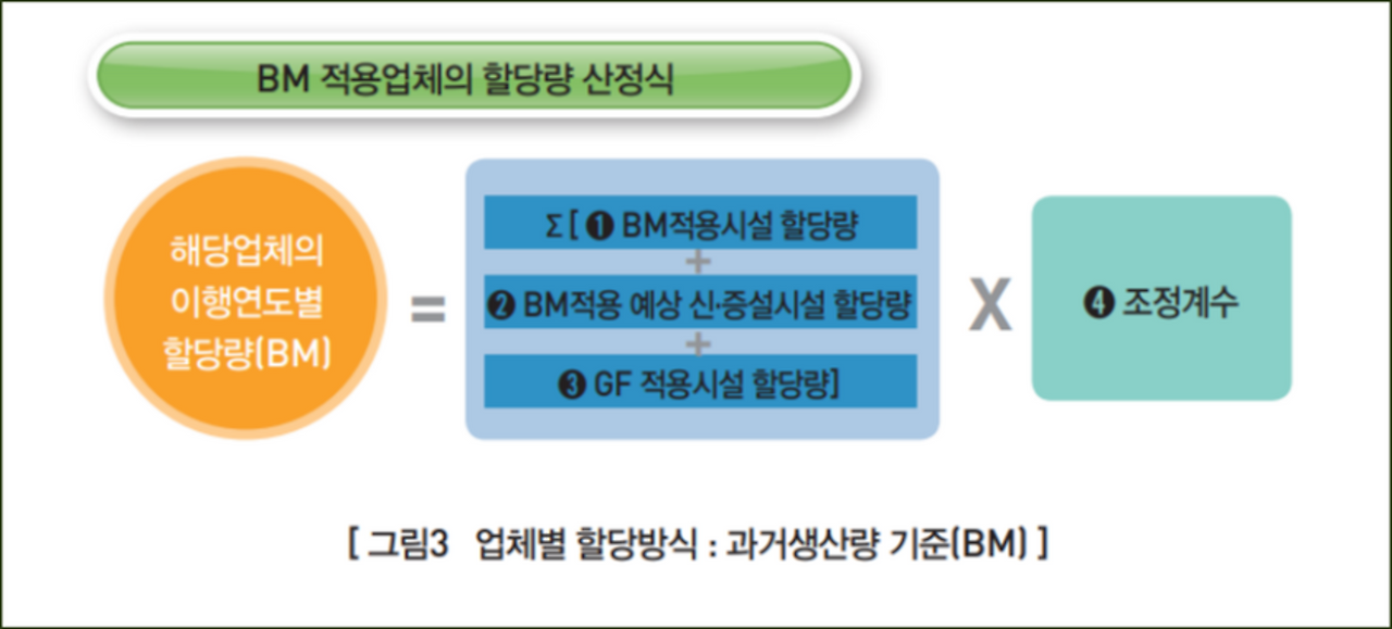 온실가스 배출권거래제에는 크게 두 가지 종류가 있습니다. 우선 과거 배출량 기반의 할당방식(GF,grandfathering)은 온실가스의 과거 배출 실적을 바탕으로 그 수준에 상응하거나 그 이하 수준으로 배출권을 할당하는 방식입니다. 대부분의 업종에 적용되는 할당방식이 바로 이 GF방식입니다. 한편 과거 생산량 기반 할당방식(BM, benchmarking)은 시멘트, 정유, 항공 업종에 대해서만 적용되는데, 제품 생산량 등 업체별 과거 활동자료를 기반으로 설비의 효율성을 고려하여 배출권을 할당하는 방식입니다. 향후 BM 계수 개발 등을 통해 2018년 2차 계획기간부터 BM할당방식이 적용되는 업종이 점차 확대될 예정이라고 합니다.