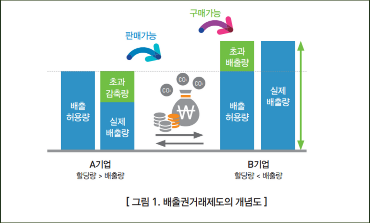 온실가스 배출권거래제란 정부가 온실가스를 배출하는 사업장을 대상으로 연단위로 배출권(Permit)을 할당(Allocation)하여 할당 범위 내에서 배출행위를 할 수 있도록 하고, 할당된 사업장의 실질적 온실가스 배출량을 평가하여 여분 또는 부족분의 배출권에 대하여는 사업장 간 거래를 허용하는 제도입니다. 온실가스 감축 여력이 높은 사업장은 보다 저렴하게 배출량을 감축하여 초과 감축량을 시장에 판매할 수 있고, 감축 여력이 낮은 사업장은 직접적인 감축을 하는 대신 배출권을 구매할 수 있어 유연성을 확보할 수 있고, 국가 차원에서도 비용의 효과성이 제고됩니다.