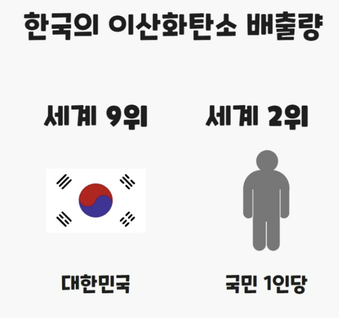 2019년 통계자료에 따르면 한국의 절대적 이산화탄소 배출량은 세계 9위입니다. 중국, 미국, 유럽, 인도, 러시아 뒤를 이어 오세아니아 대륙 전체 배출량보다 많은 양을 기록했습니다. 그런데, 여기에서 더 심각한 것은 1인당 이산화탄소 배출량인데요, 한국의 1인당 이산화탄소 배출량은 11.9t으로 세계 2위라고 합니다. 세계 평균인 4.7t의 2배가 훨씬 넘는 수치라는 점에서 전체 배출량이 적다고 안심해서는 안 된다는 것을 알 수 있습니다.