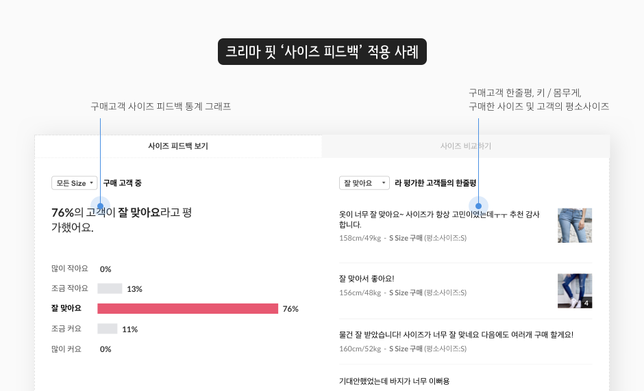 크리마의 사이즈 피드백 기능은 상품을 구매한 고객이 남긴 사이즈 피드백 데이터를 처리하여 사이즈 옵션별로 구매자들이 해당 사이즈를 어떻게 평가했는지 보여줍니다. 사이즈에 대한 평가를 통계와 한줄평으로 구분하여 제공하기 때문에 소비자는 조금 더 빠르고 정확하게 원하는 사이즈 관련 핏 정보를 확인할 수 있습니다.