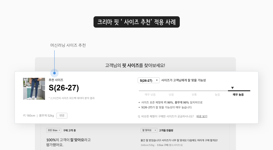 크리마는 위와 같은 고민 해결을 위한 해답으로 머신러닝 기술을 선택했습니다. 크리마는 매월 1,200여개 쇼핑몰에서 2,000만명 이상의 쇼핑몰 고객이 생성하는 200만개의 구매 고객 리뷰, 체형 정보, 사이즈 피드백 데이터와 실측 치수를 포함한 다양한 상품 데이터를 처리합니다. 이러한 양질의 데이터는 머신러닝을 통해 각 의류 카테고리별로 최적화된 엔진을 만들어냅니다. 이를 통해 소비자는 신상품에 리뷰가 없어도 본인에게 알맞은 사이즈를 추천받을 수 있습니다.