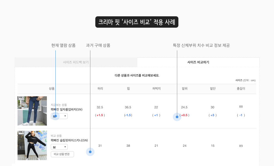 크리마 핏은 이를 해결하고자 사이즈 비교 기능을 제공하고 있습니다. 사이즈 비교 기능은 현재 구매 고민 중인 열람 상품과 과거에 구매했던 상품 중 사이즈가 잘 맞았던 상품의 실측 치수를 비교하여 사이즈 실측 치수의 차이를 보여줍니다. 이는 구매 이력이 있는 회원뿐만 아니라 비회원도 로그인 없이 상품을 검색 또는 선택하여 이용할 수 있습니다. 즉, 회원 여부에 관계없이 모든 소비자가 한눈에 실측 항목별 치수를 비교할 수 있습니다.
