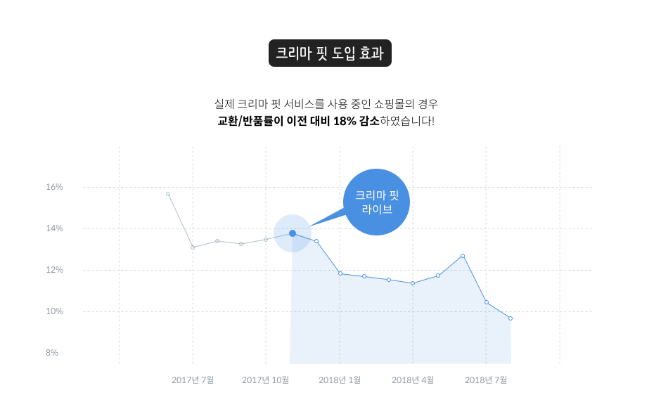 크리마 핏은 소비자의 사이즈 고민을 해결하기 위해 소비자 입장에서 생각하고, 분석하여 다양한 기능을 개발하였습니다. 사이즈에 대한 정량적인 데이터뿐만 아니라 정성적인 데이터까지 활용하여 개인 맞춤형 사이즈 정보를 제공하기 때문에, 소비자는 사이즈 고민을 보다 쉽고, 빠르게 해결할 수 있습니다. 그 결과 평균 사이즈 교환/반품률이 크리마 핏 라이브 후 기존 대비 18% 감소하는 효과를 볼 수 있었습니다.