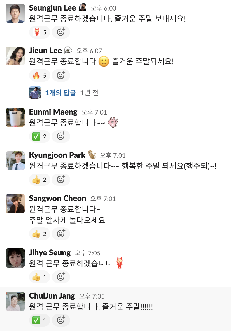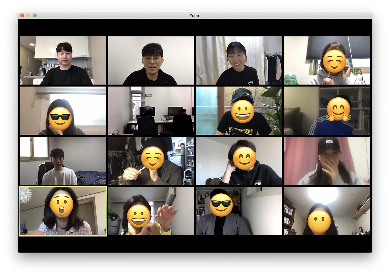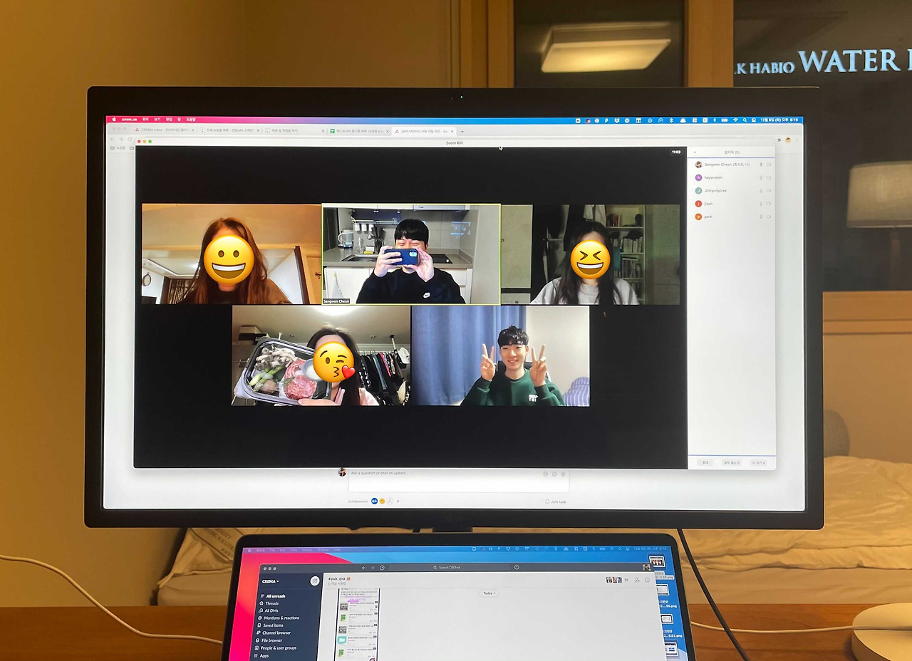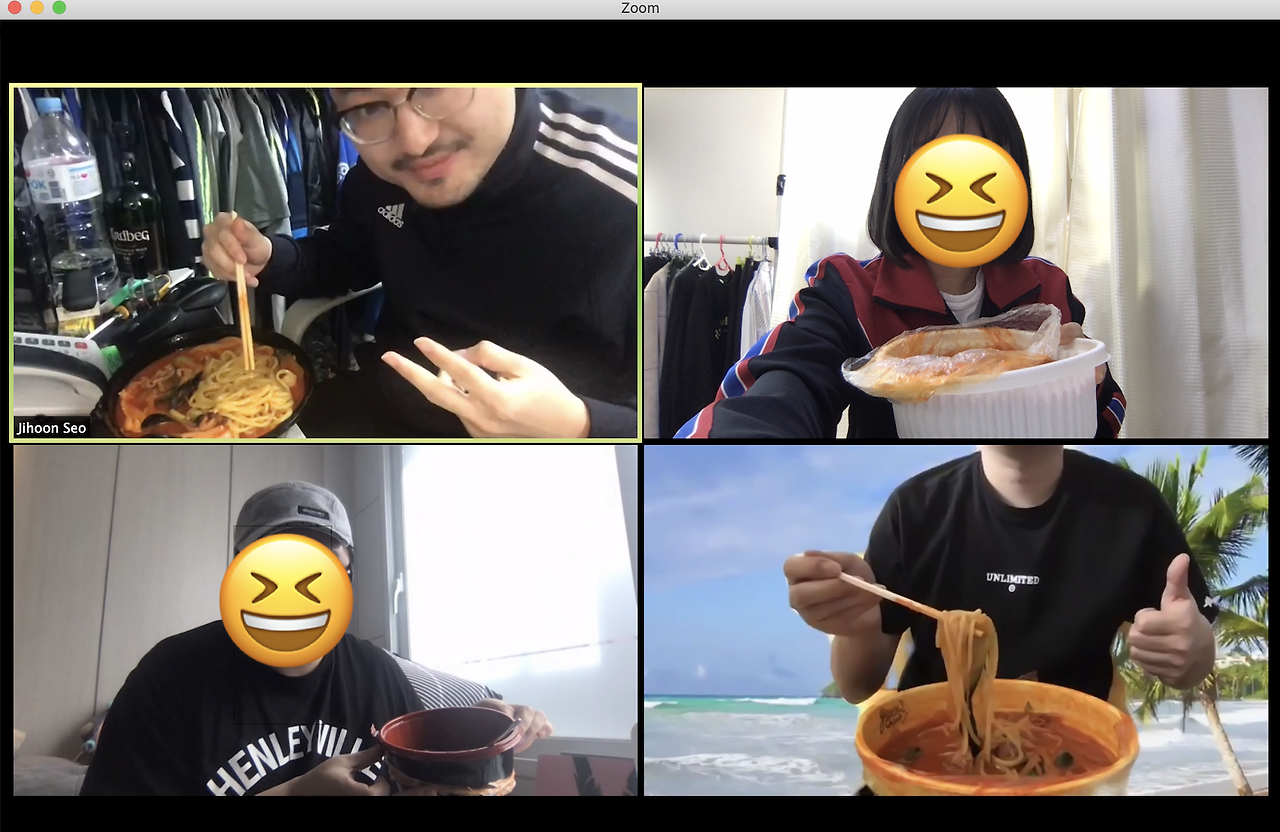 그래서 멤버들의 일상에 조금이나마 활기를 불어넣고자 화상 회식을 진행하게 되었습니다. 참석은 자유였으며, 참여하는 멤버들에게 일정 회식 비용을 지급했습니다. 물론, 음식 없이 화상 회식에 참여해 토크만 즐겨도 무관했죠. 결과는 대성공! 그동안 업무 외에 나누지 못했던 다양한 이야기들을 쏟아내느라 정신없었고, 서로가 먹방 유튜버가 된 듯한 경험을 할 수 있었습니다. 무료한 일상에 내린 단비 같다며 다들 즐거워했죠. 멤버들에게 좋은 반응을 얻은 화상 회식은 지금까지도 각 팀의 소규모 점심/저녁 회식으로 이어지고 있답니다!