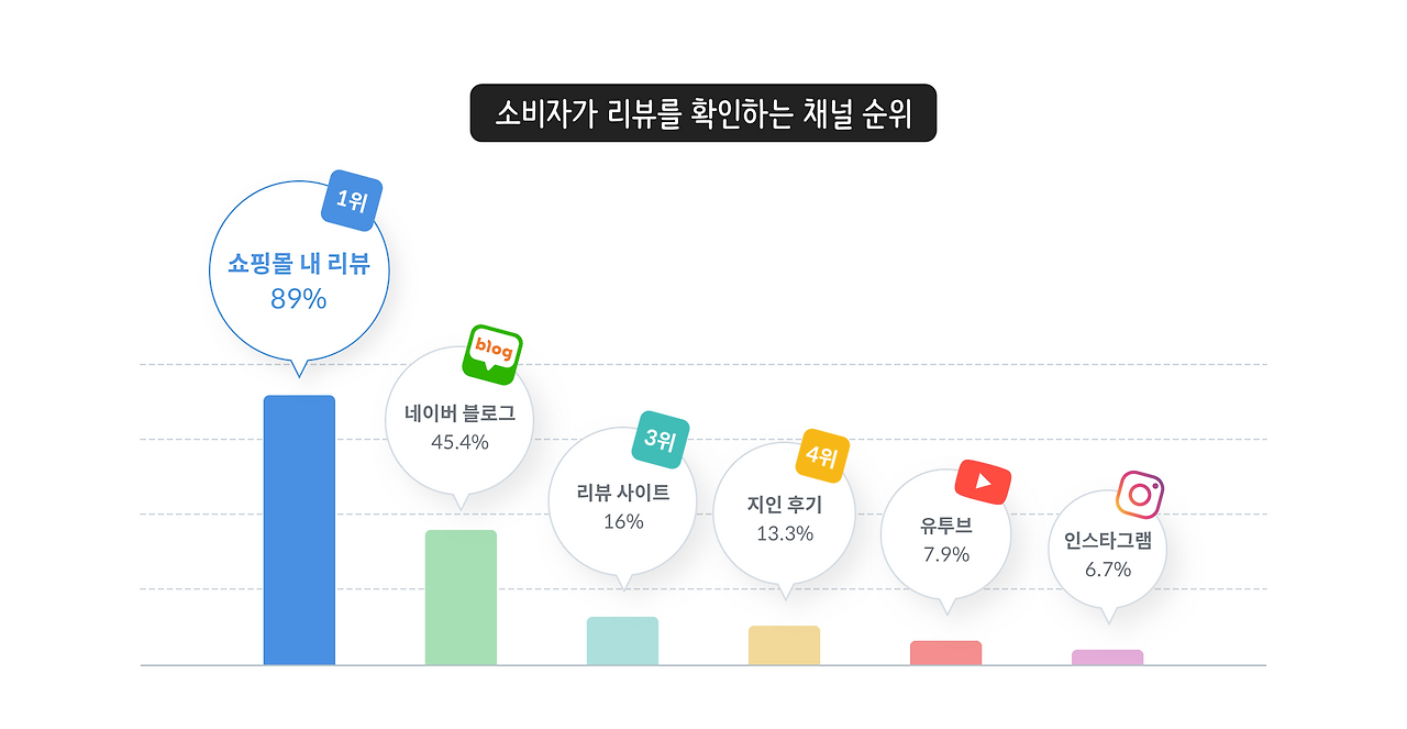 그럼, 소비자는 리뷰를 어디서 확인할까요? 리뷰의 중요성이 강조되면서 리뷰를 확인할 수 있는 다양한 채널이 형성되었습니다. 하지만 무려 89%의 소비자가 온라인 쇼핑몰 내에서 리뷰를 확인합니다. 즉, 온라인 쇼핑몰 내 리뷰가 소비자의 구매 의사 결정 과정에 가장 많은 영향을 미치게 됩니다. 그렇기 때문에 판매자는 구매 고객으로부터 많은 리뷰 확보 및 체계적인 리뷰 관리가 필요합니다.