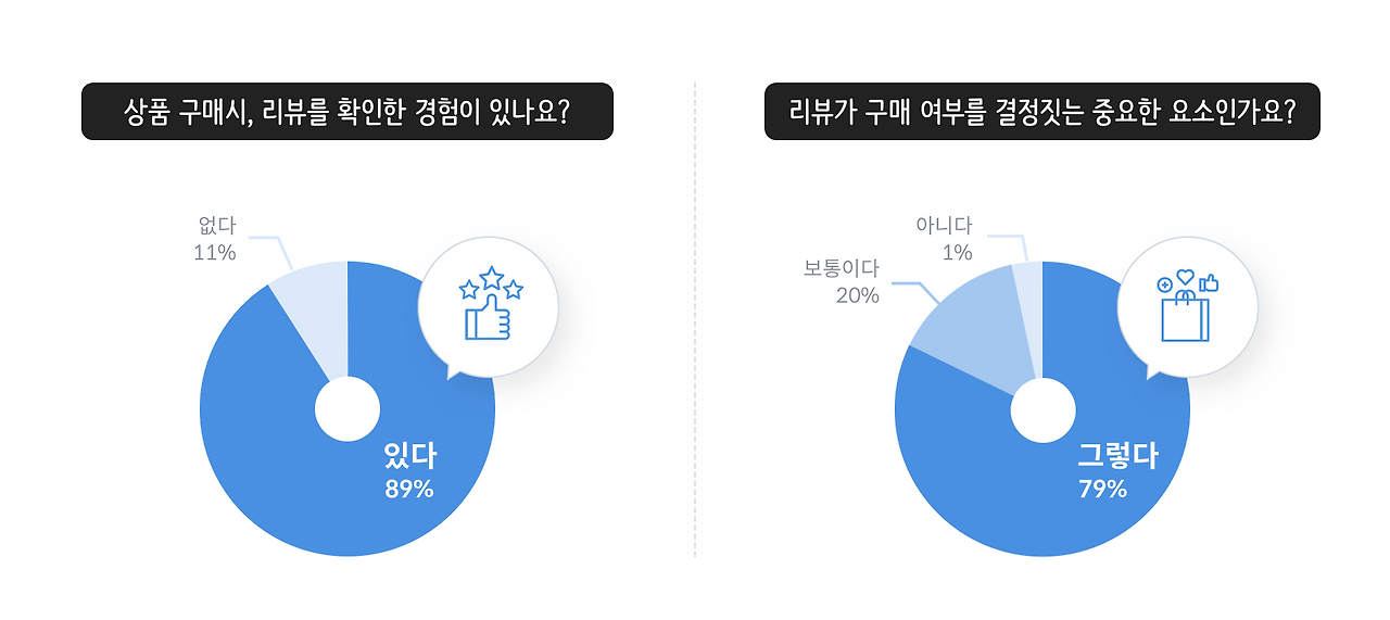 온라인 구매는 오프라인과 달리 소비자가 오감으로 상품을 체험할 수 없습니다. 특히, 전혀 구매 경험 없는 상품인 경우 판매자가 제공하는 정보만으로는 상품 구매에 대한 의사결정이 어려울 수밖에 없습니다. 그렇기 때문에 소비자는 판단을 용이하게 하고, 구매 위험을 줄이기 위해 ‘리뷰’를 통한 간접 체험을 시도합니다. 한 조사에 따르면 소비자 10명 중 9명이 온라인 구매 전 리뷰를 확인하며, 79%가 리뷰를 보고 구매 의향이 바뀐 적 있다고 답했습니다. 즉, 리뷰란 소비자에게 있어 구매 여부를 결정짓는 중요한 요소인 셈입니다.