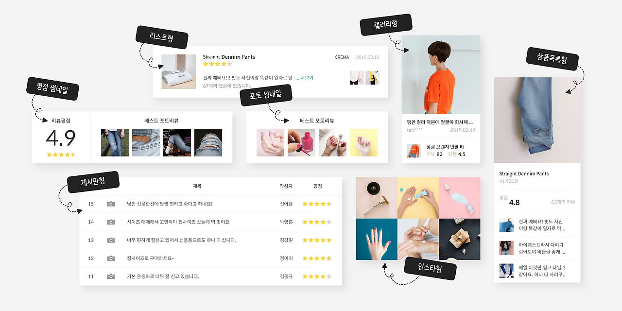크리마 리뷰는 단순히 상품 상세페이지 하단의 리뷰 게시판 개념을 벗어나 판매자가 원하는 영역에 리뷰를 노출할 수 있습니다. 상품 상세페이지 상단, 전체 리뷰 페이지, 메인 페이지, 카테고리 페이지 등 쇼핑몰에 최적화된 다양한 위젯 설치가 가능합니다. 뿐만 아니라 온라인 쇼핑몰에서 생성된 리뷰 외 SNS 상의 리뷰까지 노출할 수 있습니다. 결과적으로 소비자는 최소한의 클릭으로 원하는 시점에 많은 리뷰를 확인할 수 있어 빠른 구매 결정에 도움을 받을 수 있습니다.