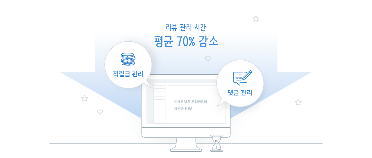 크리마 리뷰의 관리자 페이지는 적립금 자동 계산 및 일괄 지급, 댓글 프리셋 및 일괄 작성, 세트 상품 리뷰 연동 등 여러 가지 편리한 기능을 통해 리뷰 관리 시간을 기존 대비 평균 60~70% 정도 감소시킵니다. 판매자는 감소된 시간을 이용해 유의미한 리뷰를 간추려 상품 및 온라인 쇼핑몰의 개선점을 빠르게 파악할 수 있습니다.