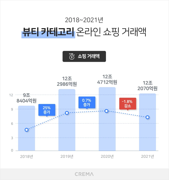 코로나19가 뷰티 카테고리에 얼마나 큰 영향을 미쳤는지 알기 위해서는 통계청의 ‘온라인 쇼핑 동향' 조사를 먼저 살펴볼 필요가 있습니다. 2019년 뷰티 카테고리 온라인 쇼핑 거래액은 12조 2986억 원으로 2018년 대비 무려 25% 증가했었습니다. 하지만, 2020년은 12조 4712억 원으로 2019년 대비 0.7% 증가에 그쳤고, 코로나19가 가장 심했던 2021년은 12조 2070억 원으로 2020년 대비 거래액이 1.8% 감소했습니다. 집에서 보내는 시간이 늘어나고, 마스크로 얼굴의 반 이상을 가리고 다니다 보니 상대적으로 화장을 덜 하게 되면서 관련 소비가 크게 줄어들었죠.