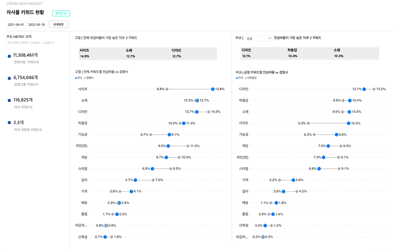위 그림의 우측 지표를 보면 '사이즈'에 대한 긍정 언급 비율이(10.2%) 업계 평균(5.5%)보다 2배가량 높게 나타납니다. 이는 우리 브랜드의 고객들이 '사이즈'에 대해서는 매우 만족하고 있다는 것을 나타냅니다. 이에 반해 '디자인(12.1%)'이나 '색상(7.9%)'은 긍정적으로 언급되고 있지만, 업계 평균보다 낮은 언급 비율을 보이고 있기 때문에 개선의 여지가 있는 영역으로 판단할 수 있습니다. 긍정 언급 비율뿐 아니라 부정 언급 비율도 확인할 수 있습니다. 만약 특정 키워드의 부정 언급 비율이 업계 평균보다 높게 나타난다면, 빠르게 문제를 찾고 개선함으로써 잠재적인 리스크를 줄이고 자사몰 고객들의 만족도를 높일 수 있겠죠.