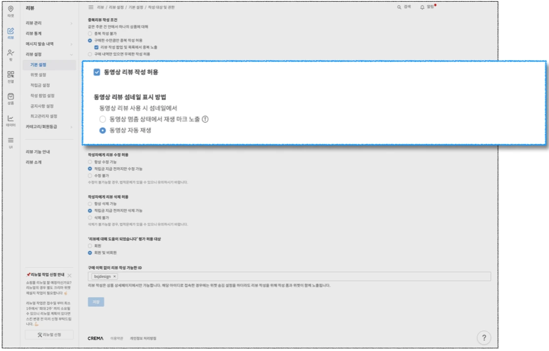 동영상 리뷰가 자동으로 재생되기를 원할 경우 ‘관리자 페이지→리뷰 설정→기본 설정→작성 대상 및 권한→동영상 리뷰 섬네일 표시 방법’에서 설정 가능합니다.