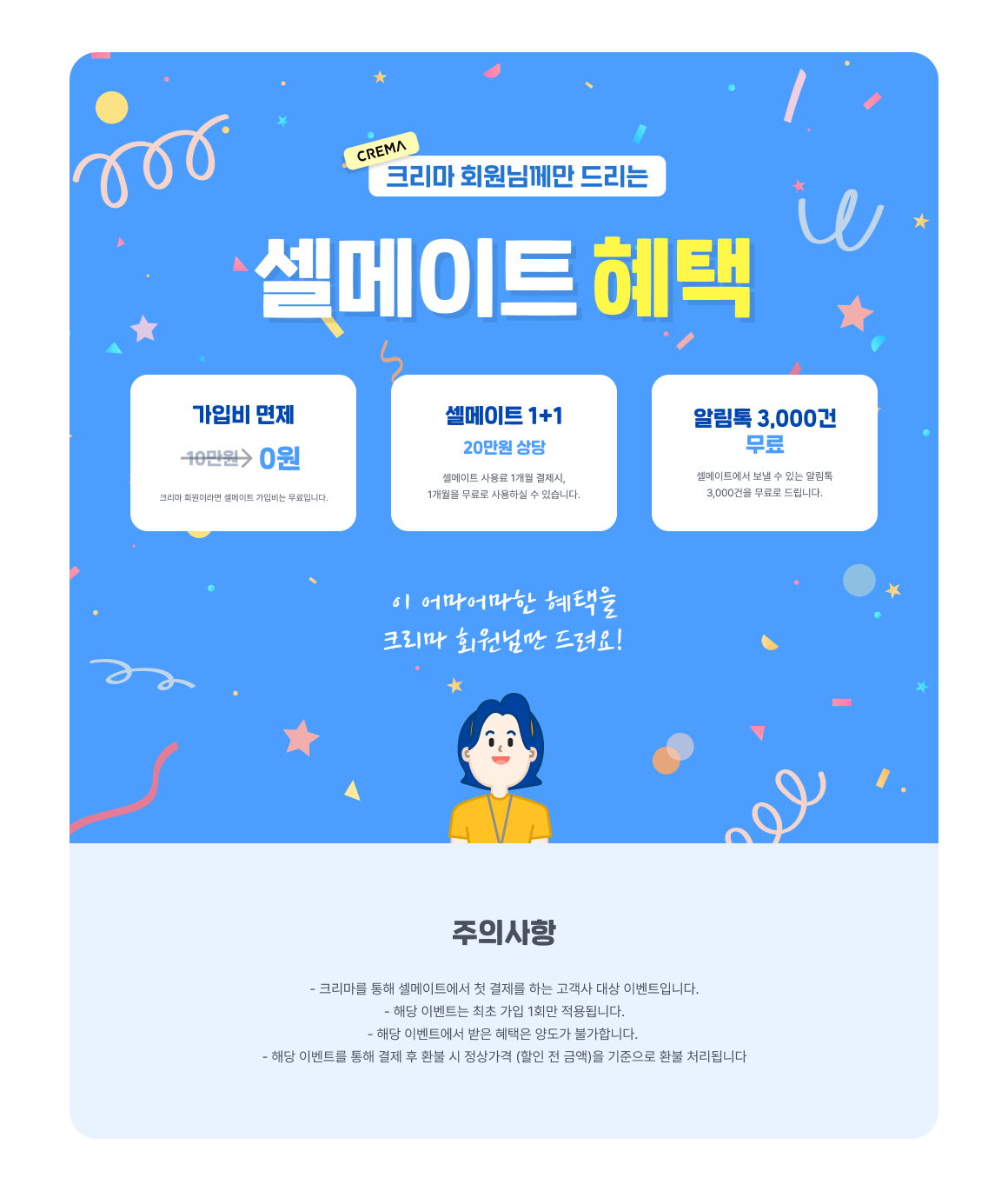 해당 프로모션은 셀메이트에서 첫 결제를 하는 고객사 대상으로만 진행되며, 최초 가입 1회만 적용됩니다. 또한, 받은 혜택은 양도가 불가하니 참고 부탁 드립니다. 자세한 내용은 아래 링크에서 확인해보세요!
