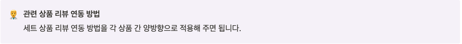 B에슬레져 자사몰을 운영하고 있는데, 저도 비슷한 고민을 가지고 있어요. 상의, 하의를 각각의 상품으로 판매하다 특정 시점에 상의+하의 세트 상품 기획전을 열어요. 세트 상품 페이지를 생성해서 리뷰 없이 판매를 시작해야 하다 보니, 판매가 이루어지기까지 시간이 좀 걸리는 편이죠. 세트 상품 페이지에 리뷰가 쌓이기를 기다리는 시간이 너무 아까워요. 기존 상품에 있던 리뷰를 세트 상품으로 옮겨올 수는 없는 걸까요?