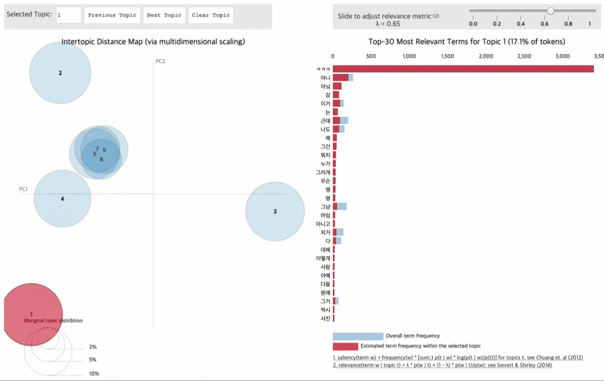 ㅋ이 들어간 5.5만 건의 문장들을 LDA 모델을 통해 8개의 토픽으로 나눠 보았고, PCA(주성분 분석)으로 차원을 축소하여 토픽 간 거리를 2차원 좌표로 시각화하였다.