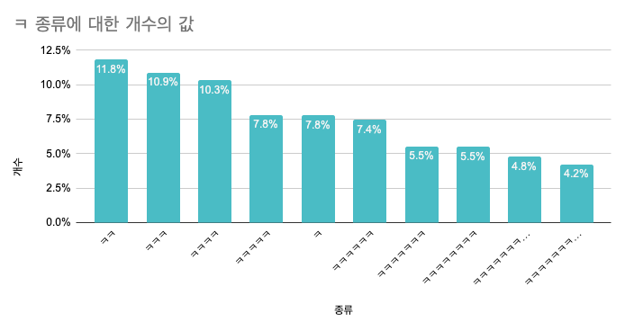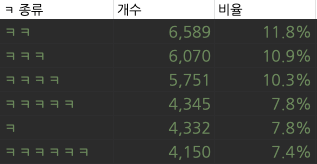 또한, 순차적으로 개수가 늘어나는 것 같지만 ㅋ는 5번째로 많이 사용되었다.