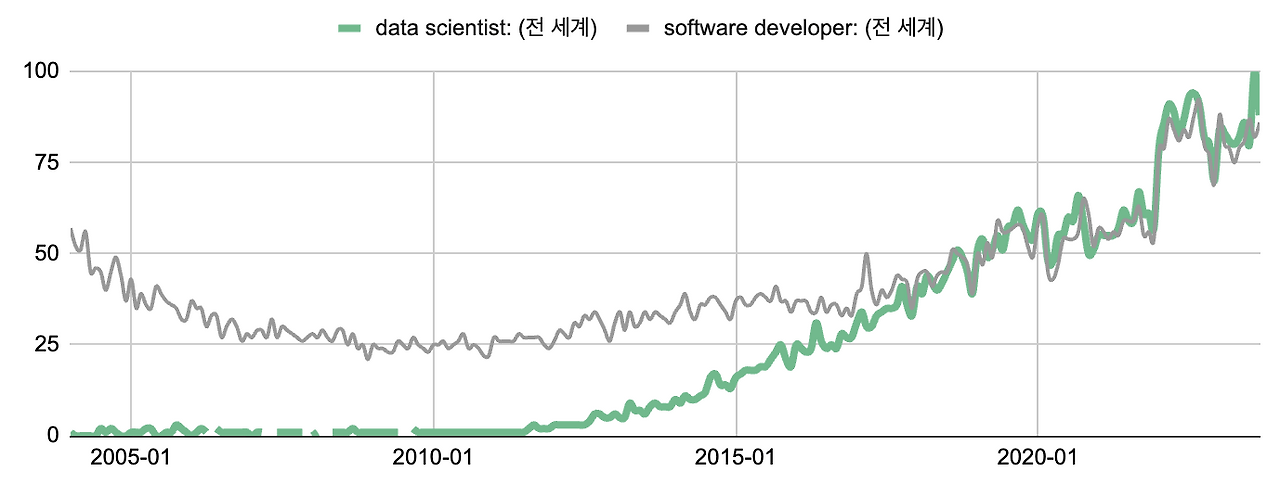 * 데이터 과학자라는 키워드는 2010년도 초에 점차 검색량이 증가했다