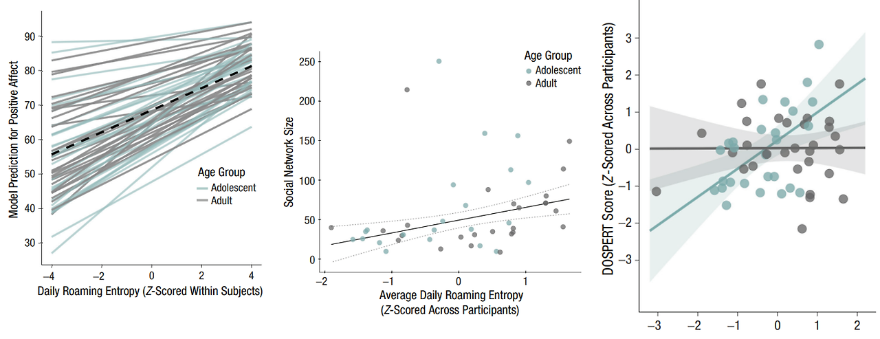 UCLA 심리학과 나탈리 사라고사-해리스(Natalie Saragosa-Harris) 교수 등의 연구진은 물리적 이동량에 따른 정서와 위험 선호성, 그리고 사회적 연결 정도를 측정해 그 결과를 Psychological Science에 발표했다. 13세에서 27세의 청소년과 성인들을 모집해 GPS로 석 달 넘게 추적해 측정한 결과, 물리적 이동량이 많은 사람들이 더 행복했으며, 더 폭넓은 인간관계를 형성하고, 새로운 경험에 개방적이면서 위험 선호적인 사고 방식을 갖고 있음이 확인되었다(Saragosa-Harris, N. M., Cohen, A. O., Reneau, T. R., Villano, W. J., Heller, A. S., & Hartley, C. A. (2022). Real-World Exploration Increases Across Adolescence and Relates to Affect, Risk Taking, and Social Connectivity. Psychological Science, 33(10), 1664-1679.).