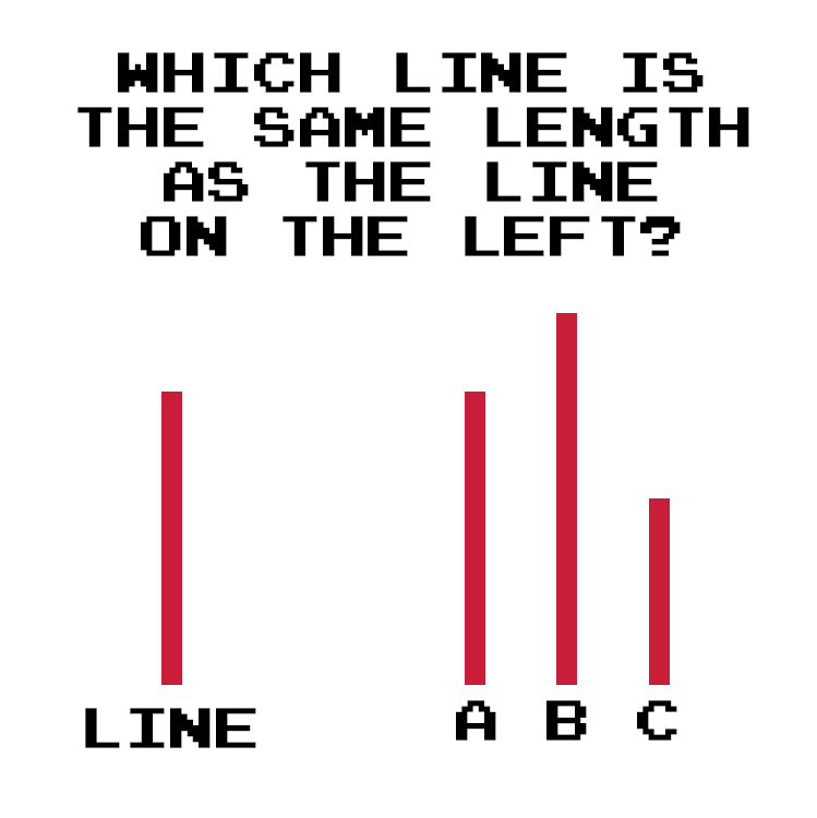 심리학 역사 상, 가장 큰 반향을 일으킨 실험 중 하나로 꼽히는 것이 바로 1955년에 진행된 솔로몬 애쉬(Solomon Asch)의 동조 실험이다. 실험실엔 원탁이 준비되어 있고, 여섯 명의 참가자가 자리에 앉자마자 실험이 시작된다. 이 사람들에게 실험자는 차례로 질문을 던지는데, 참가자들은 기준으로 주어진 선분과 같은 길이의 선분이 어떤 것인지 답해야 한다. 누가 봐도 답은 A로 명백하지만, 첫번째 참가자부터 B라고 엉뚱한 답을 하기 시작한다. 다음 참가자 역시 자신있게 B를 외치고, 마지막 참가자가 답하기 직전까지 모든 참가자들의 답은 B로 일관된다. 그리고 마지막 참가자에게 질문을 던지자, 이전에 답했던 다섯 명의 참가자가 일제히 마지막 참가자를 쳐다 본다. 사실, 이 다섯 명은 실험자와 사전에 공모한 사람들이다. 이 실험에서 75%의 참가자는 적어도 한 번은 동조 반응을 나타냈다.