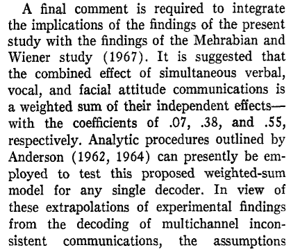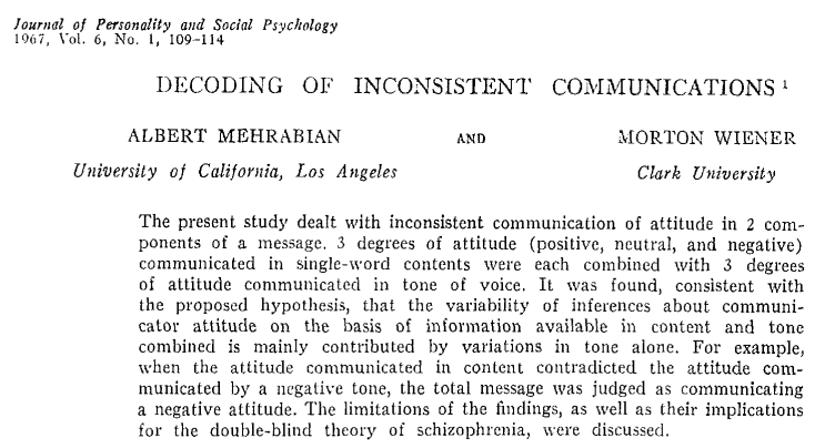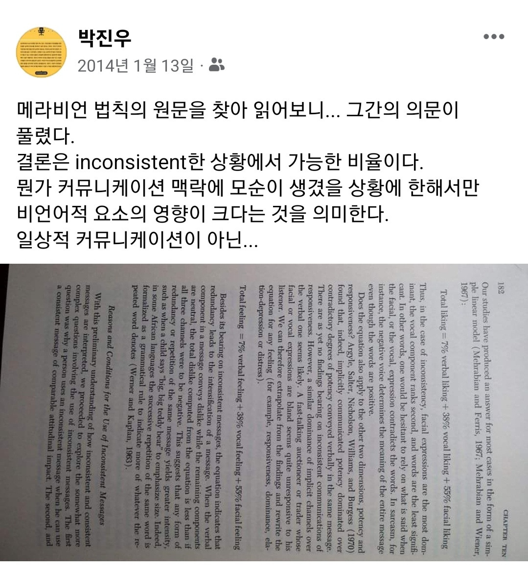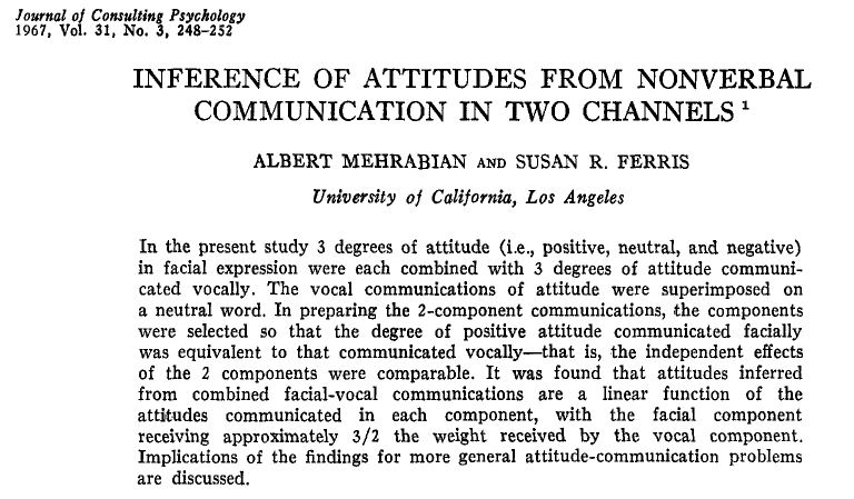 메라비언이 '말의 내용과 태도가 불일치하거나, 말의 내용이 모호할 때'라는 전제를 분명히 했다면 어땠을까?