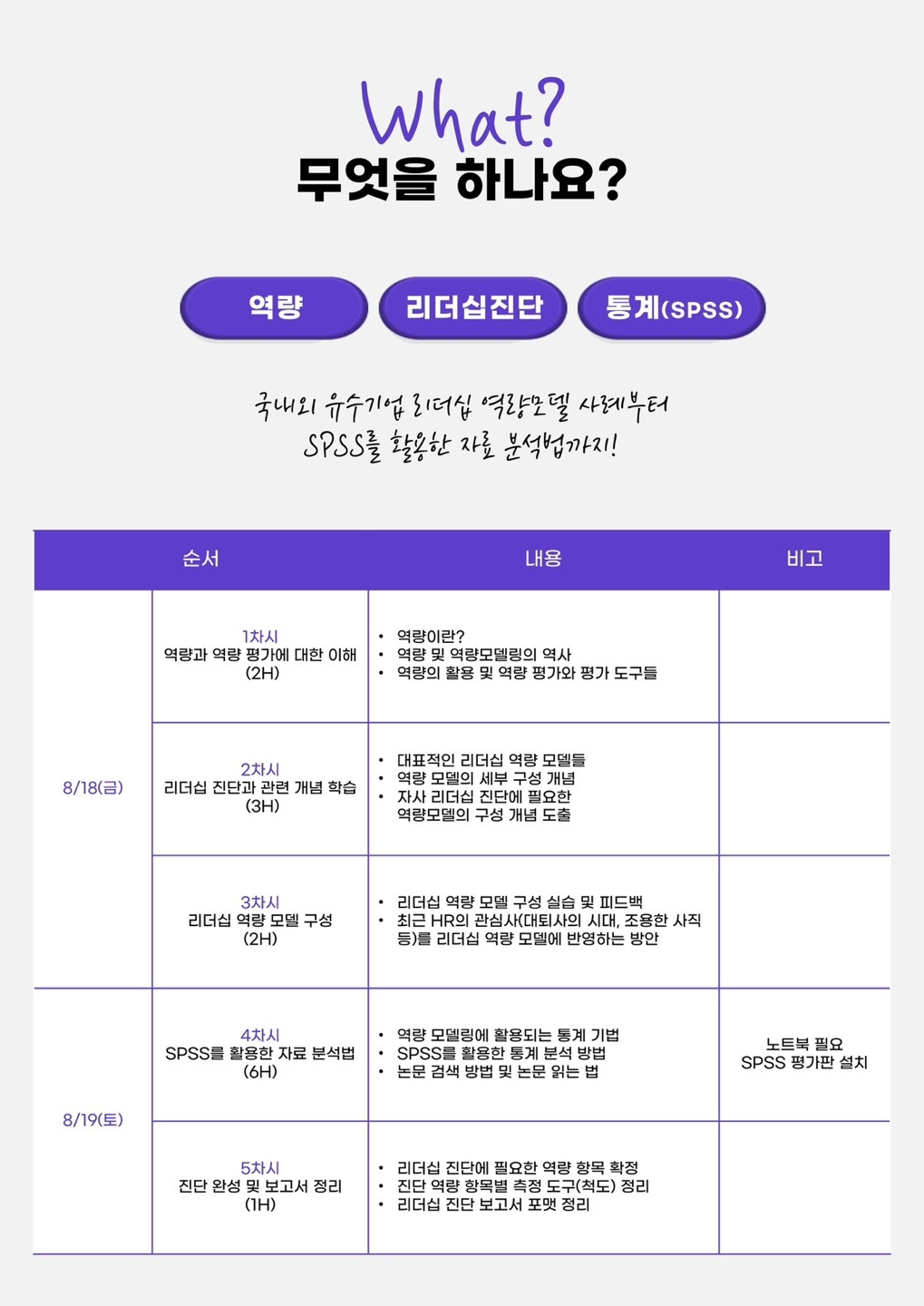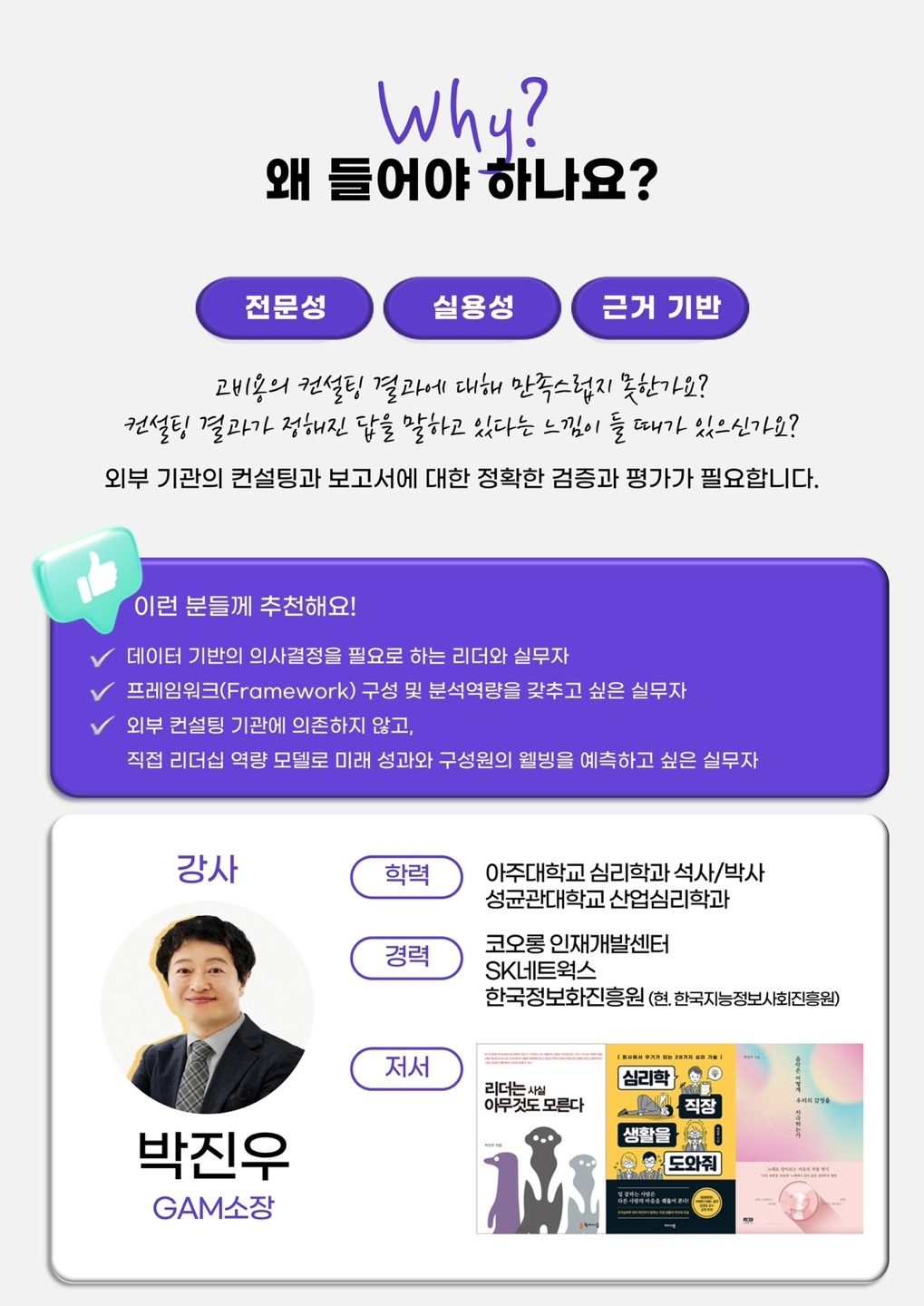 일부 역량 및 조직 진단 컨설팅 회사의 나쁜 버릇이 우리나라 HR에서 완전히 뿌리 뽑히는 그날까지 많은 HR 및 기업문화 담당자들이 각성하고 학습하면 좋겠다. 그리고 감히 이 과정이 우리나라 HR 및 기업문화 담당자들의 필수 과정으로 자리잡길 희망한다. 담당자들이 이 프로그램을 통해 학습할 진단 프레임워크 구성 역량과 분석 역량은 설령 HR을 떠나더라도 빛을 발할 것이다.
