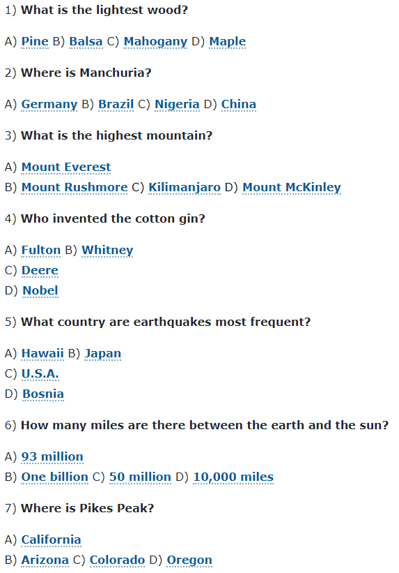 그렇다. 문항은 대부분 다양한 분야에 호기심을 가지고 제대로 암기하고 있는지를 테스트한 것들이다. "퀴즈쇼 세상만사"라고나 할까. 에디슨이 생각한 좋은 인재의 기준은 다양한 분야에 관한 호기심과 기억력이었던 것 같다. 물론 산업심리학자들은 당시에도 이보다 훨씬 체계적인 직무 수행 기본 능력을 테스트하는 문항들을 개발했지만, 에디슨이 시도한 것처럼 현실에서 접할 수 있는 정보에 관한 문제가 아니라, 고차원적인 정신 조작 능력(지능 검사)에 가까운 문항들이었다.