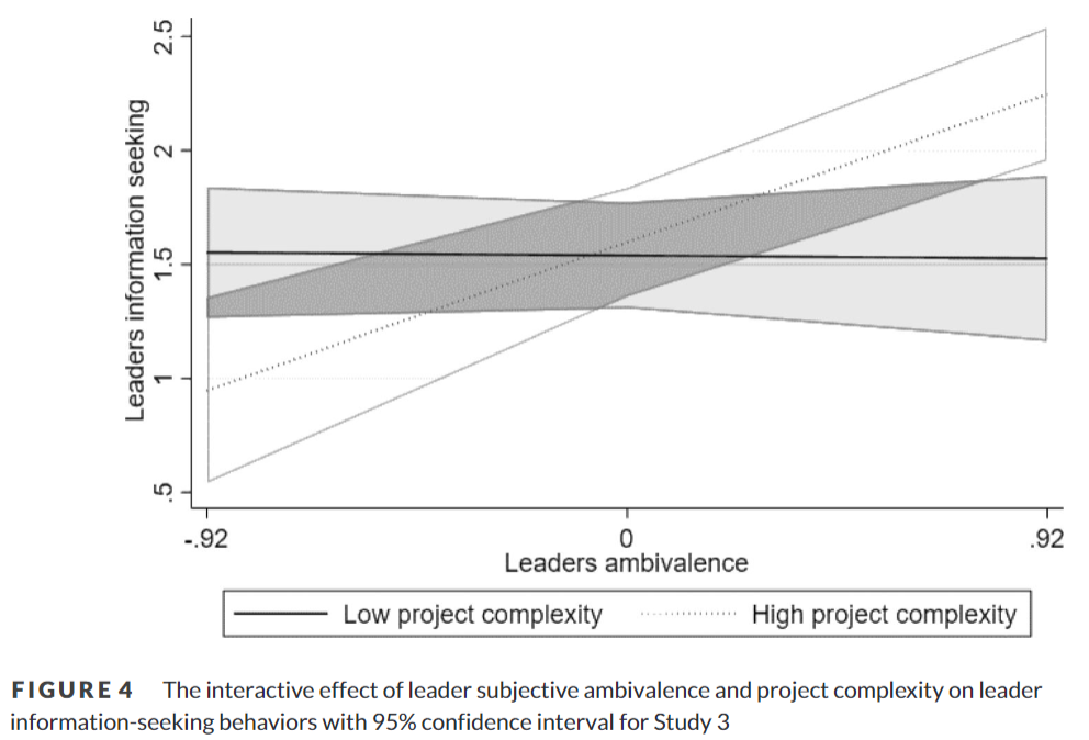 그렇지 않았다. 리더의 양가감정이 도움이 되는 프로젝트는 복잡하고 난이도가 높은 경우에 한했다. 쉬운 프로젝트의 경우 리더의 양가감정은 정보추구행동으로 이어지지 않았다. 누가 봐도 쉬운 문제를 리더가 양가감정으로 고민하고 질문을 한다면, 어떤 구성원이 신뢰할 수 있겠는가? 아마 리더는 쉬운 프로젝트의 경우, 해당 프로젝트와 관련한 정보를 구성원들에게 질문하기가 썩 바람직하지 않다는 사실을 이미 알고 있을 것이다.