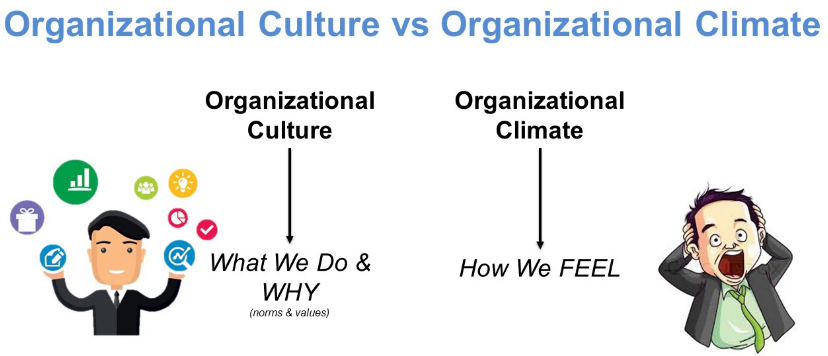 조직 문화가 보다 근본적인 행동 규범이나 가치에 해당한다면, 조직 풍토는 겉으로 보이거나 느껴지는 분위기를 말한다. 조직문화 담당자가 하는 일은 조직의 미션, 비전, 핵심 가치, 구성원들의 몰입과 직무 만족, 조직 학습 등의 변화 관리 활동을 통해 조직 풍토를 바꾸는 것이다.