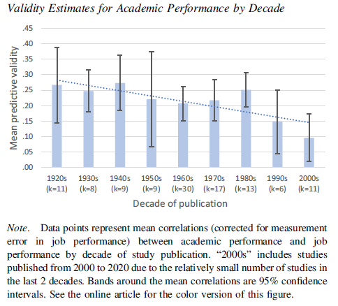 과거에 비해 현대의 일은 학교에서 배운 지식과 기술이 직접 적용되지 않는다. 현대의 직무는 창의성, 리더십을 요하는데 학교에서는 이런 자질을 가르치지 않고 성과에 필요한 지식과 기술은 빠르게 변한다. 또한, 학점 인플레이션 문제도 있다. 학생들의 졸업 평균 학점은 점점 높아지고 있기 때문에 예측력 역시 감소하고 있다. 실력이 다른 학생들이 동일한 학점을 받고 졸업하니, 학점으로 성과를 예측하기는 더 힘들다. 그럼에도 불구하고 성적은 여전히 성과를 설명하는 통계적으로 유효한 변수다.
