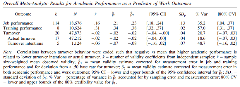 응용심리학저널(Journal of Applied Psychology) 최신호에 관련 내용이 실려 소개한다. 연구자들은 학업 성적과 성과와의 관계를 연구한 150개 가량의 연구를 종합했다(Van Iddekinge, C. H., Arnold, J. D., Krivacek, S. J., Frieder, R. E., & Roth, P. L. (2024). Making the grade? A meta-analysis of academic performance as a predictor of work performance and turnover. Journal of Applied Psychology.).