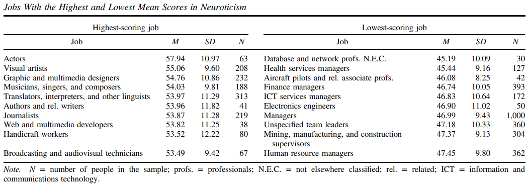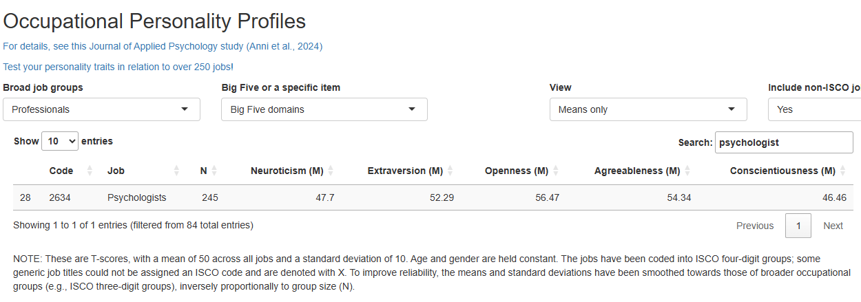 이 연구의 재미있는 점은 실용성이다. 연구진은 결과를 공개 데이터베이스(https://apps.psych.ut.ee/JobProfiles/)로 만들어 누구나 자신의 성격과 직업 프로파일을 비교해볼 수 있게 했다. 그렇다면, 심리학자들의 성격 프로파일은 어떨까? 심리학자들은 개방성과 외향성, 원만성이 높고 신경증성과 성실성이 낮은 사람들이다. 개방성 외에는 내 성격 특성과는 잘 맞지 않는다. 아마, 상담심리학자들이 많이 참여한 때문인 듯하다.