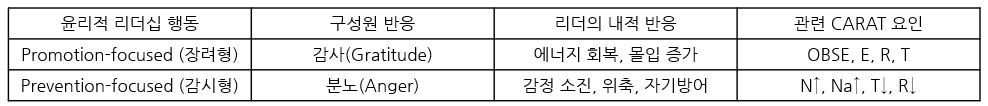 - 다른 하나는 Prevention-focused ethical leadership이다. 이 행동은 비윤리적 행동을 ‘단속’하는 방식(감시, 경고, 처벌)으로 구성원들의 분노(anger) 반응을 이끈다.