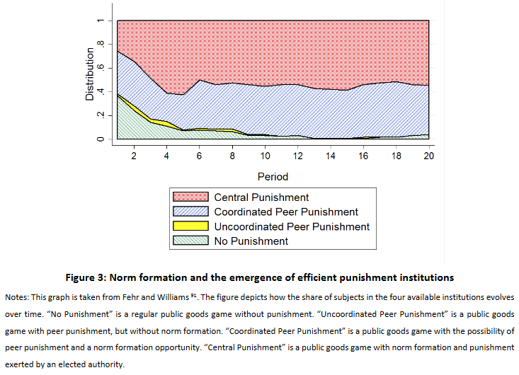 즉, 협력 유지에 가장 효과적인 제도는 <norms + central punishment> 체계다. 규범은 스스로 유지되지 않는다. 규범은 정당한 권위에 의해 일관되게 집행될 때 유지된다.