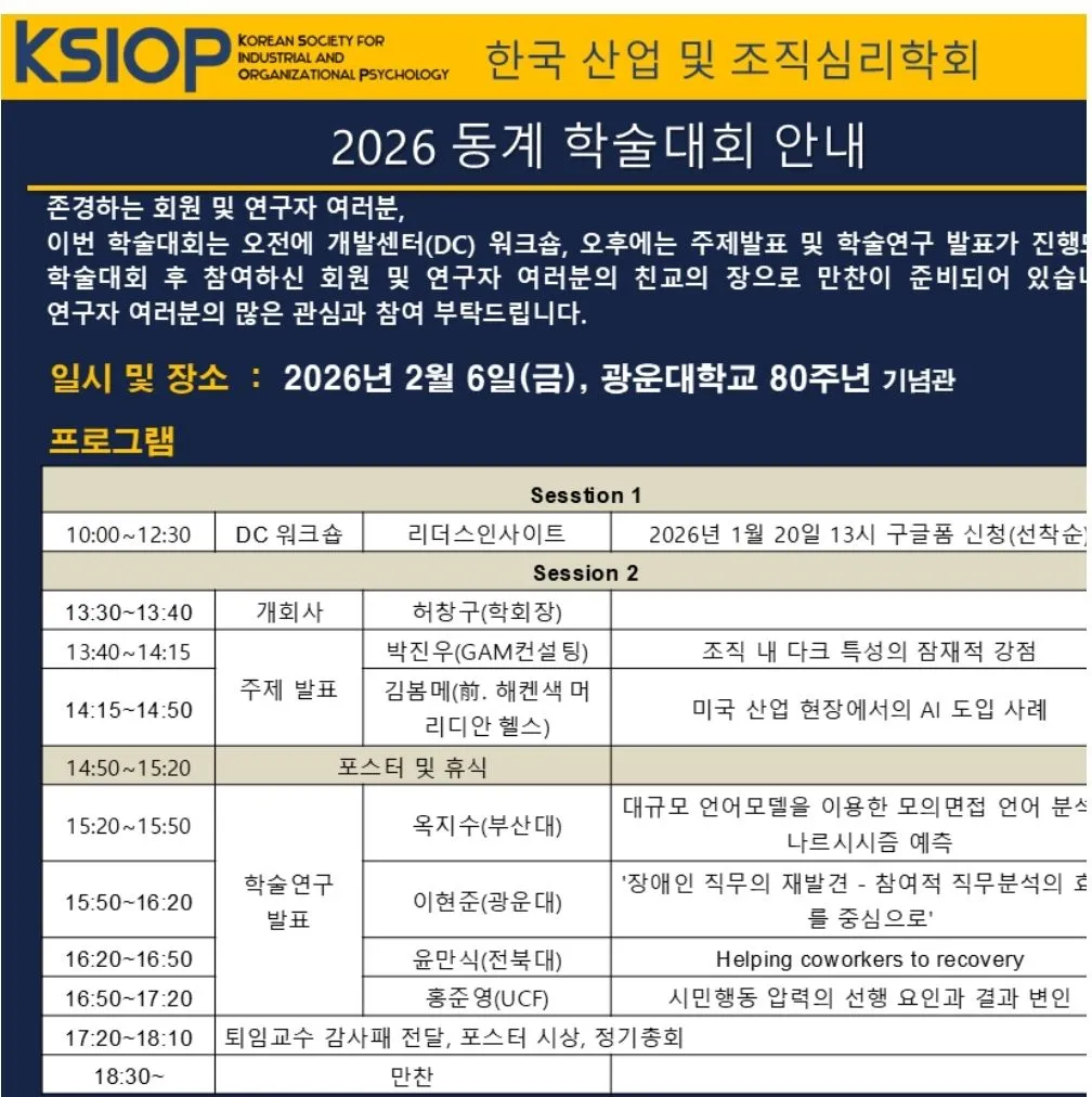제가 2026 한국 산업및조직심리학회에서 <조직 내 다크 특성의 잠재적 강점>이라는 주제로 발표를 합니다.
