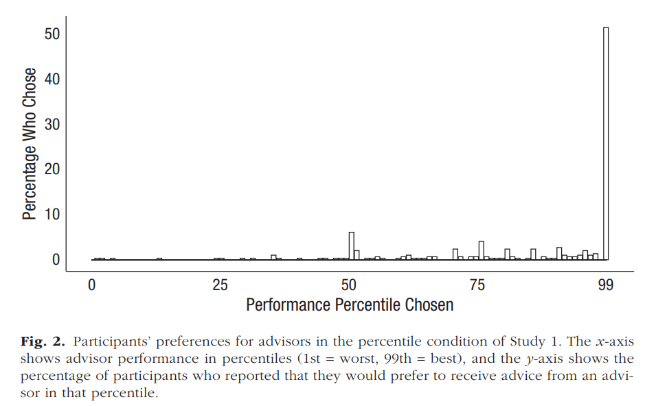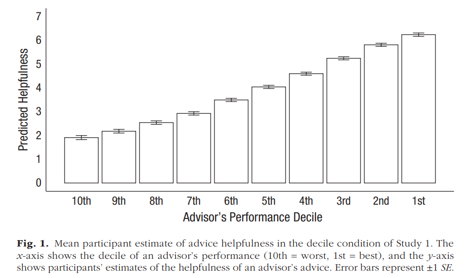 실험 결과, 사람들은 해당 조언이 얼마나 도움이 될지는 현재 그 사람의 성과가 중요하다고 믿었다. 그래서 더 높은 성과를 보일수록 더 좋은 조언을 할 것이라고 예측했다. 아래 그래프처럼, 사람들은 1등이 그 분야의 꼴찌보다는 훨씬 좋은 조언을 줄 것이고, 2등보다는 약간 더 나은 도움을 줄 것이라고 생각했다.