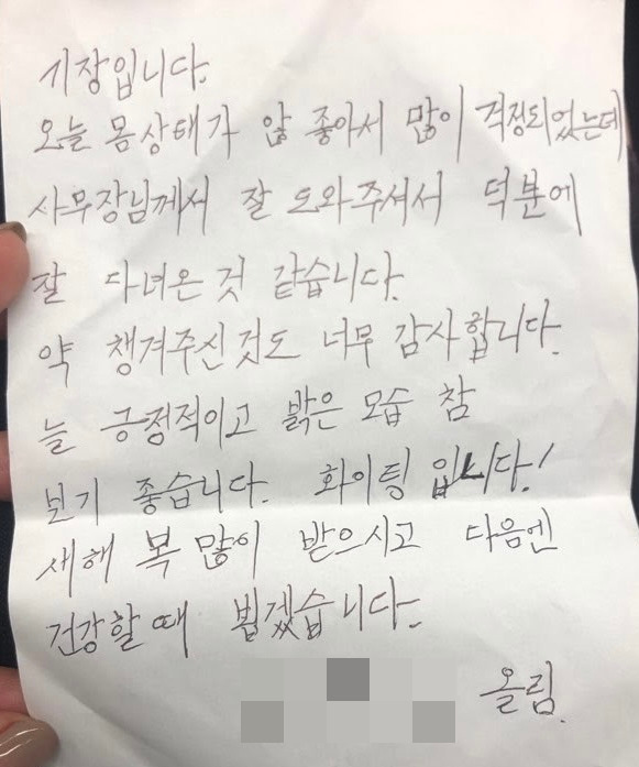 그는 훈훈한 감사 인사를 하며 쭈뼛쭈뼛 나를 향해 무언가를 내민다. 이게 뭔가 싶어서 펼쳐 보니 기장님이 손글씨로 쓴 편지였다.