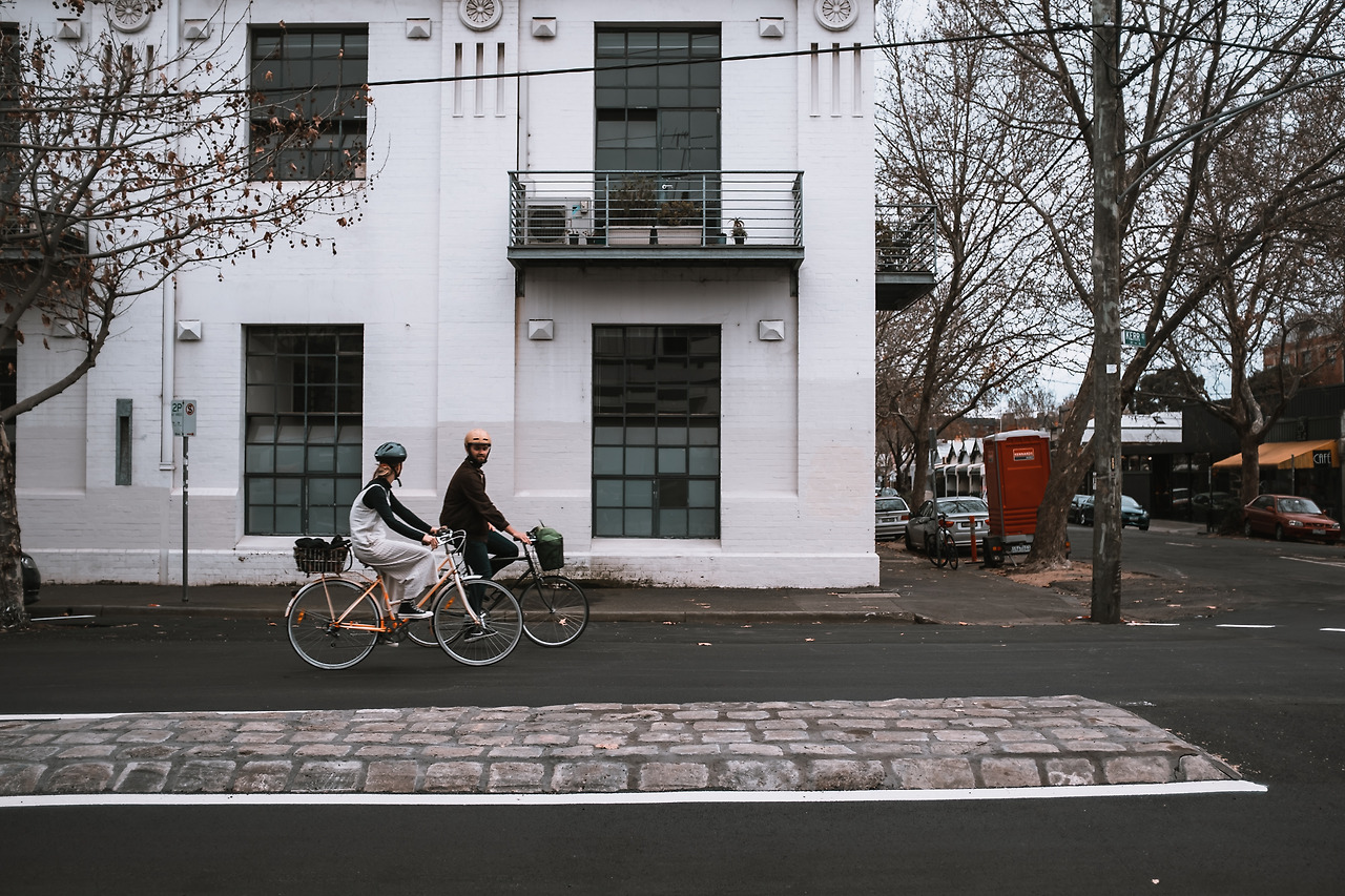 거리의 정경에 어울리는 자전거 탄 커플. 여성의 자전거 색과 남성의 헬맷의 색이 비슷해 조화롭다. 상대의 어떤 부분을 닮아간다.