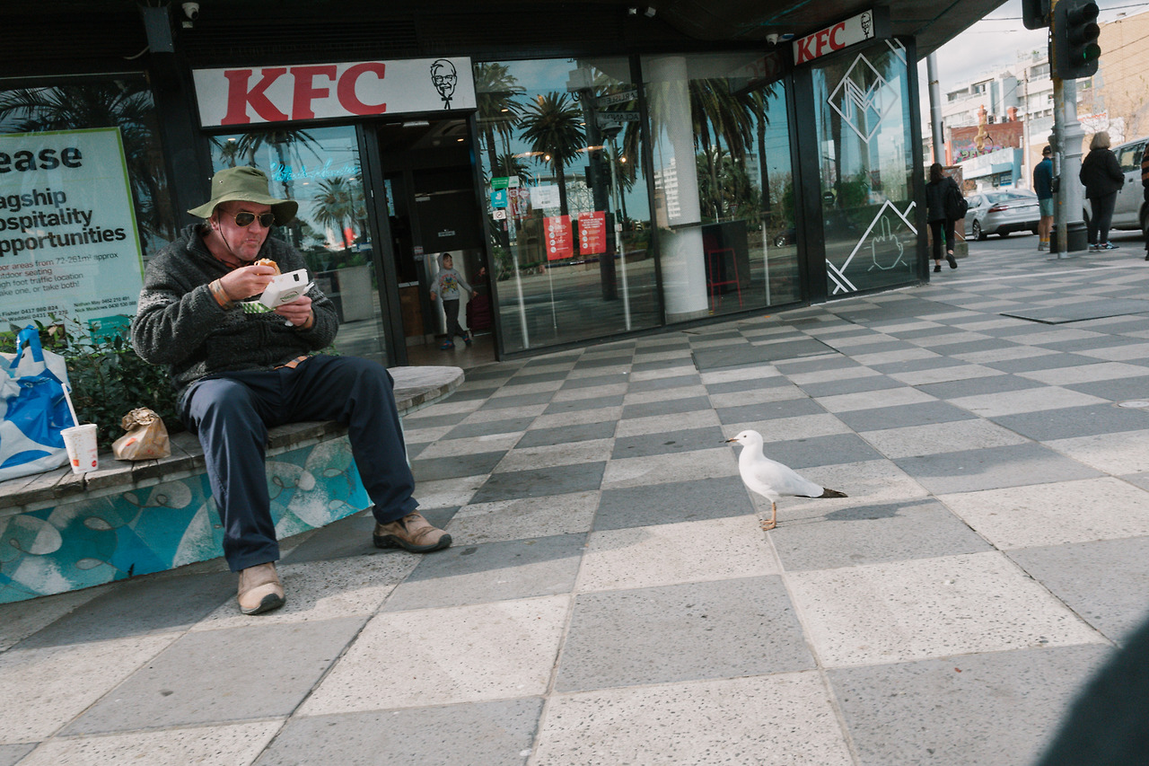 셔터를 누르기 위해선 몇 가지 요소가 충족되어야 한다. 1. 피사체가 흥미롭고 2. 그 피사체가 잘 보여야 하고 3. 배경과 조화를 이뤄야 하고 4. 웃겨야 하고(가장 중요하다) 5. 이야기에 도움이 되는 구도가 있어야 한다. 거리 사진에선 사진기 든 사람이 상황을 통제하지 않는다(몇몇은 그러기도 한다). 대부분의 흥미로운 장면은 순간적으로 일어났다 사라진다. 일어났다 사라지는 사이에 위 조건을 최대한 충족시키는 방법을 생각하고 실행에 옮긴다.