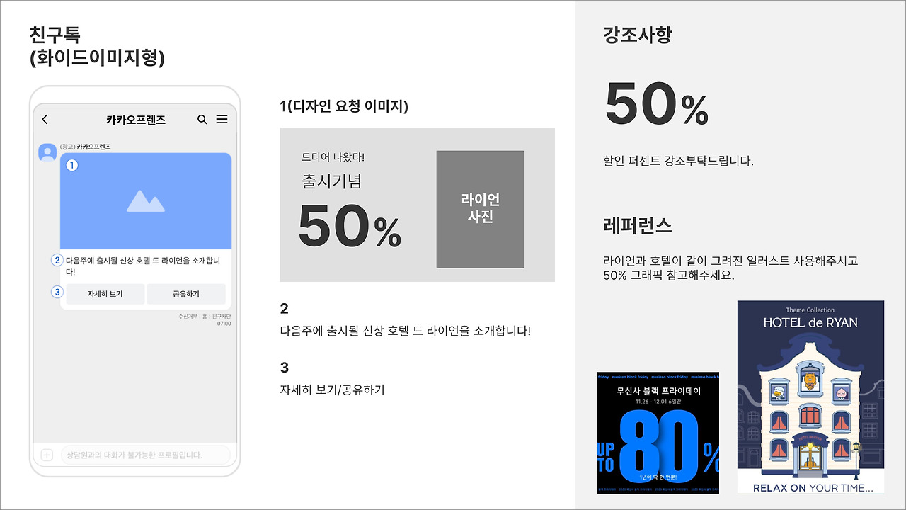 이렇게 머릿속으로 상상할 수 있는 형식의 기획서를 전달한다면 수정의 수정의 수정을 거치는 지리한 과정을 겪지 않고 원하는 결과물을 받아보실 수 있습니다.