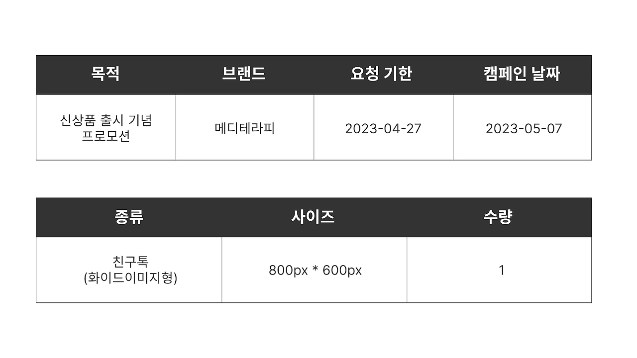 왼쪽도 깔끔하게 내용이 정리되어있지만 머릿속에 상상하던 결과물과 막상 받아본 디자인 결과물 간의 괴리가 굉장히 클 수 있는 기획서입니다. 마음에 쏙 드는 높은 성과를 내는 소재를 받고싶다면 오른쪽처럼 기획서를 작성하는 것을 추천합니다.
