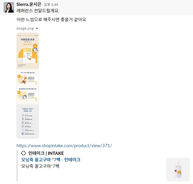 종종 통이미지로된 레퍼런스나 url로된 레퍼런스를 받은 디자이너들은 당황합니다. 하나의 이미지, 혹은 페이지에 담긴 무수한 정보 중 어떤 부분이 마케터가 원하는 디자인일까 스스로 기획서와 비교하며 찾아가는 과정을 겪게됩니다.