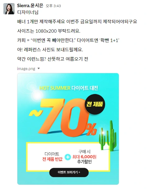요청 기한 안에 디자인을 완성하더라도 언제 어떤 수정 사항이 발생할지 모릅니다. 그렇기 때문에 정말 ‘최종에최최종.jpg’를 언제까지 완성하면 될지 인지할 수 있게 따로 작성해주는 것이 좋습니다.