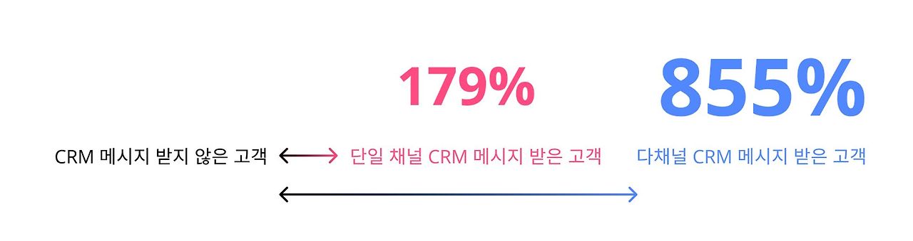 이메일 혹은 SMS등 CRM 메세지를 받은 고객의 참여도는 그렇지 않은 고객보다 179% 높다고 합니다. 여기서 하나의 단일 채널 메세지가 아닌 여러 채널의 메세지를 수신한 고객들은 메세지를 수신하지 않은 고객보다 참여도가 최대 855% 증가한다고 합니다.