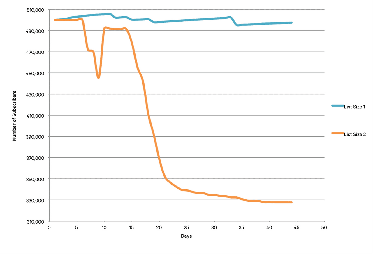 아래 그래프는 45일 동안 50만명의 구독자를 대상으로 마케팅을 진행한 결과입니다.