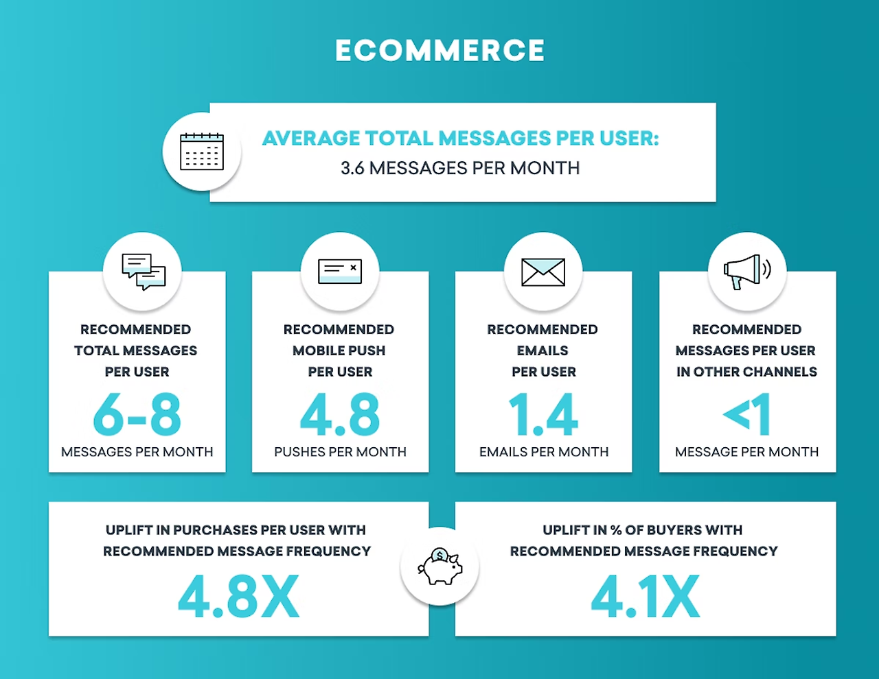 Braze의 데이터에 따르면 최적의 빈도로 발생한 메세지를 받은 사용자가 그렇지 않은 사용자에 비해 5배 많은 구매를 기록하였고 4.1배 높은 구매 전환율을 기록했다고 합니다.